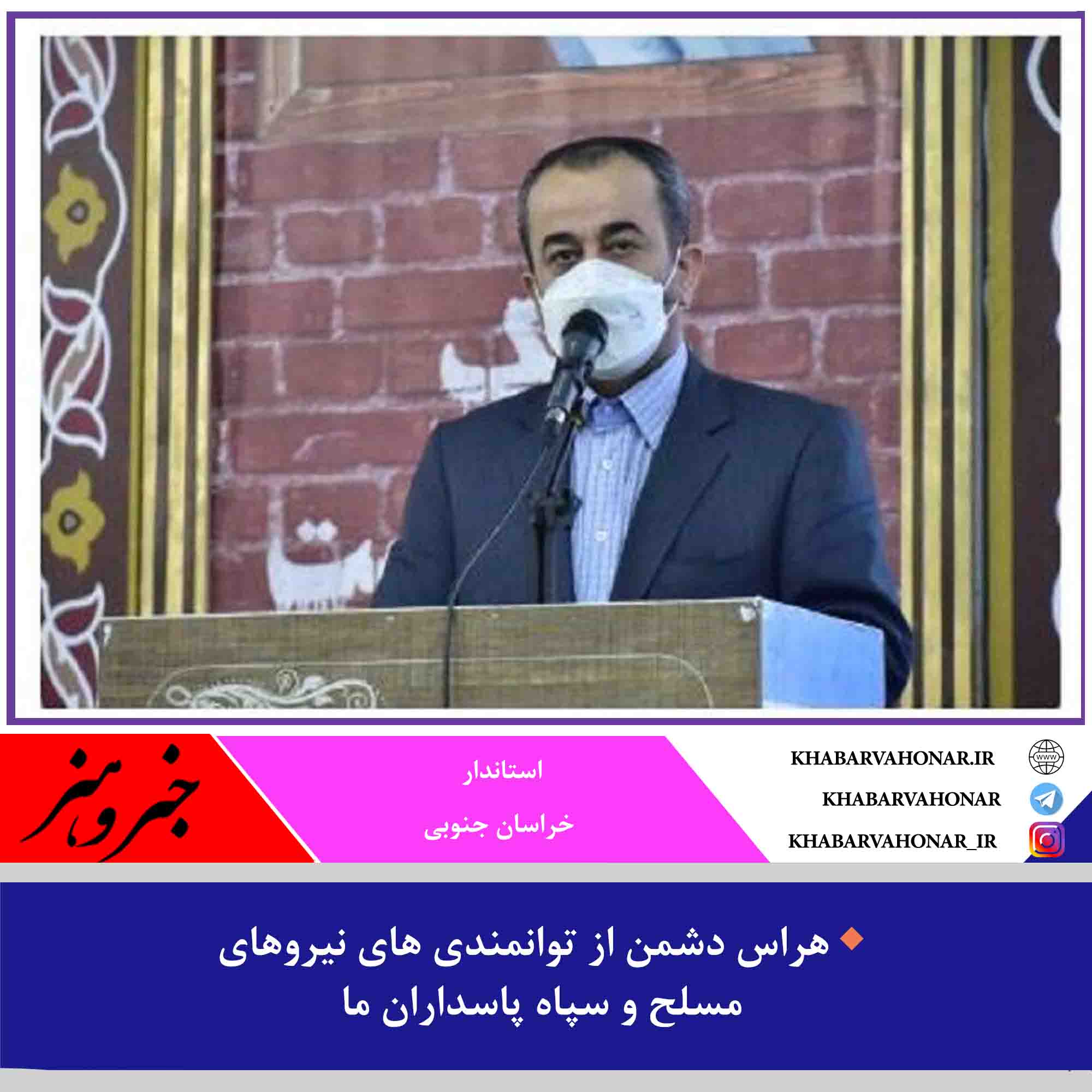 ?استاندار خراسان جنوبی تأکید کرد: دشمن از توانمندی های نیروهای مسلح و سپاه پاسداران ما هراس و واهمه دارد.