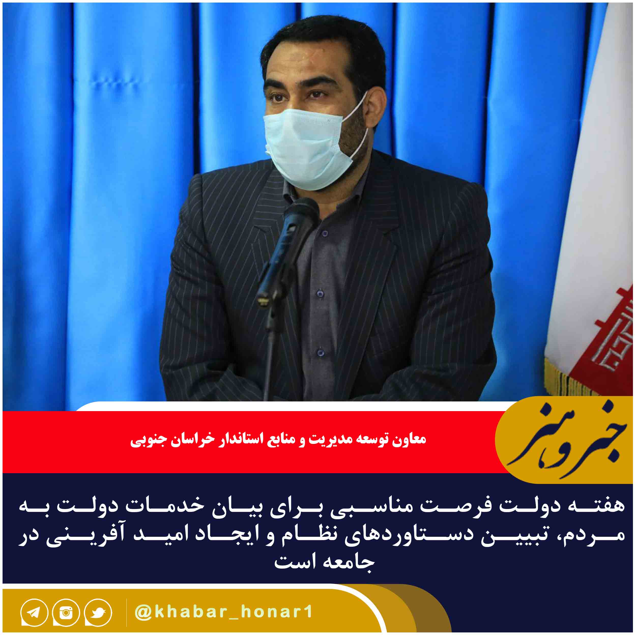 ?معاون توسعه مدیریت و منابع استاندار خراسان جنوبی گفت: هفته دولت فرصت مناسبی برای بیان خدمات دولت به مردم، تبیین دستاوردهای نظام و ایجاد امید آفرینی در جامعه است.
