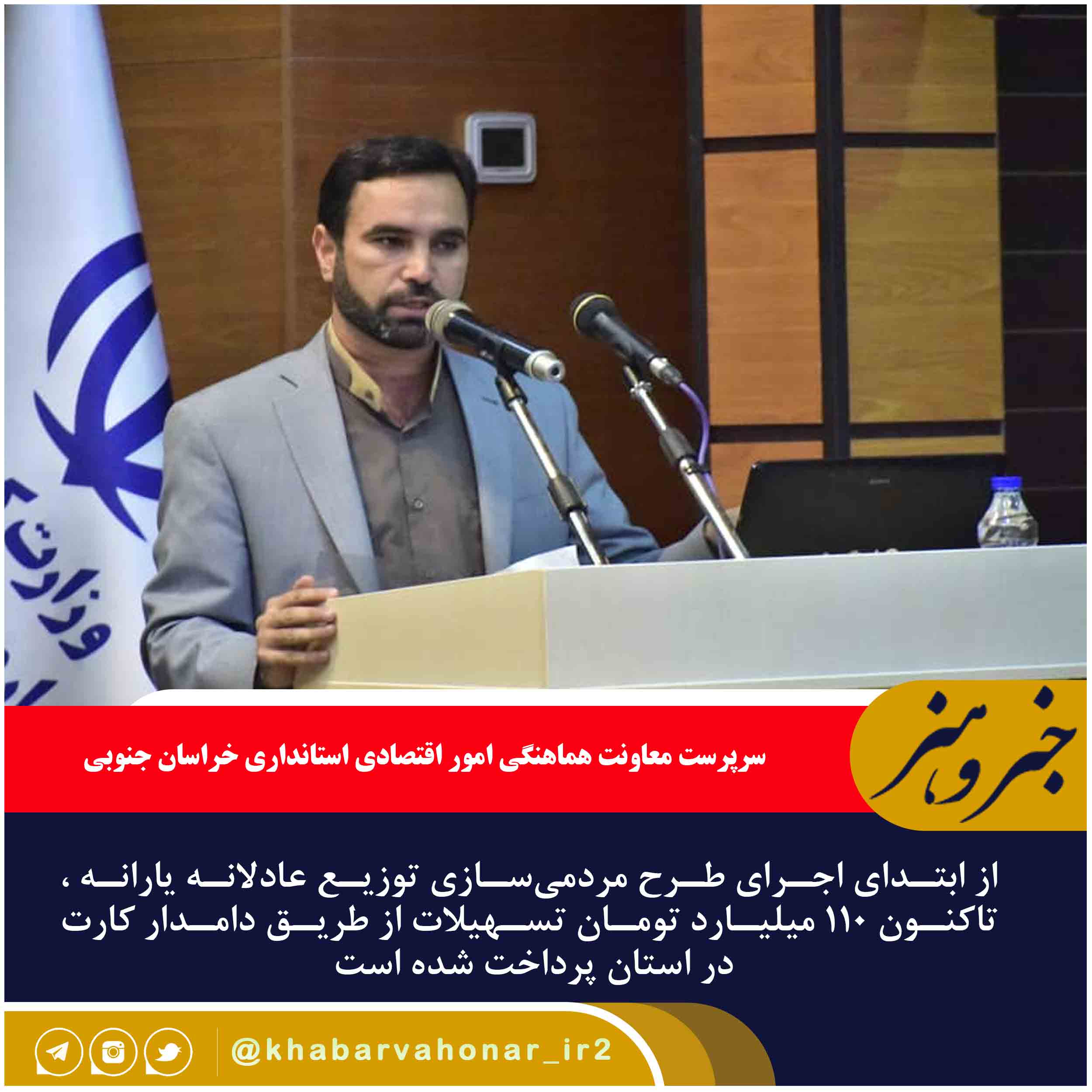 ?سرپرست معاونت هماهنگی امور اقتصادی استانداری خراسان جنوبی گفت: از ابتدای اجرای طرح مردمیسازی توزیع عادلانه یارانه ، تاکنون ۱۱۰ میلیارد تومان تسهیلات از طریق دامدار کارت در استان پرداخت شده است.