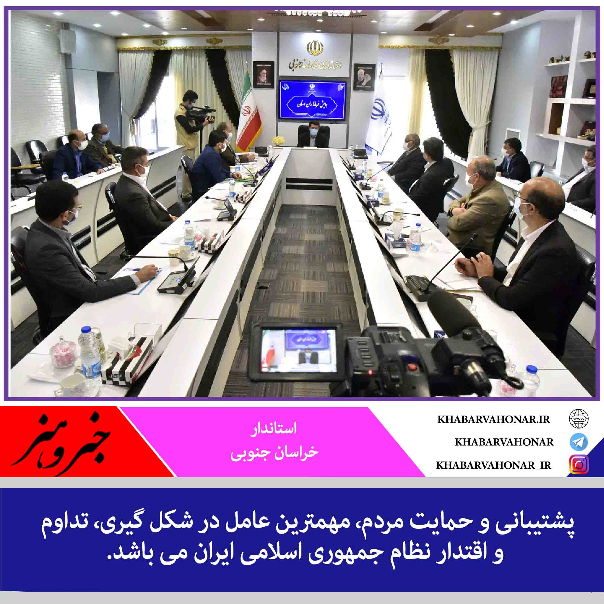 ?استاندار خراسان جنوبی گفت: پشتیبانی و حمایت مردم، مهمترین عامل در شکل گیری، تداوم و اقتدار نظام جمهوری اسلامی ایران می باشد.