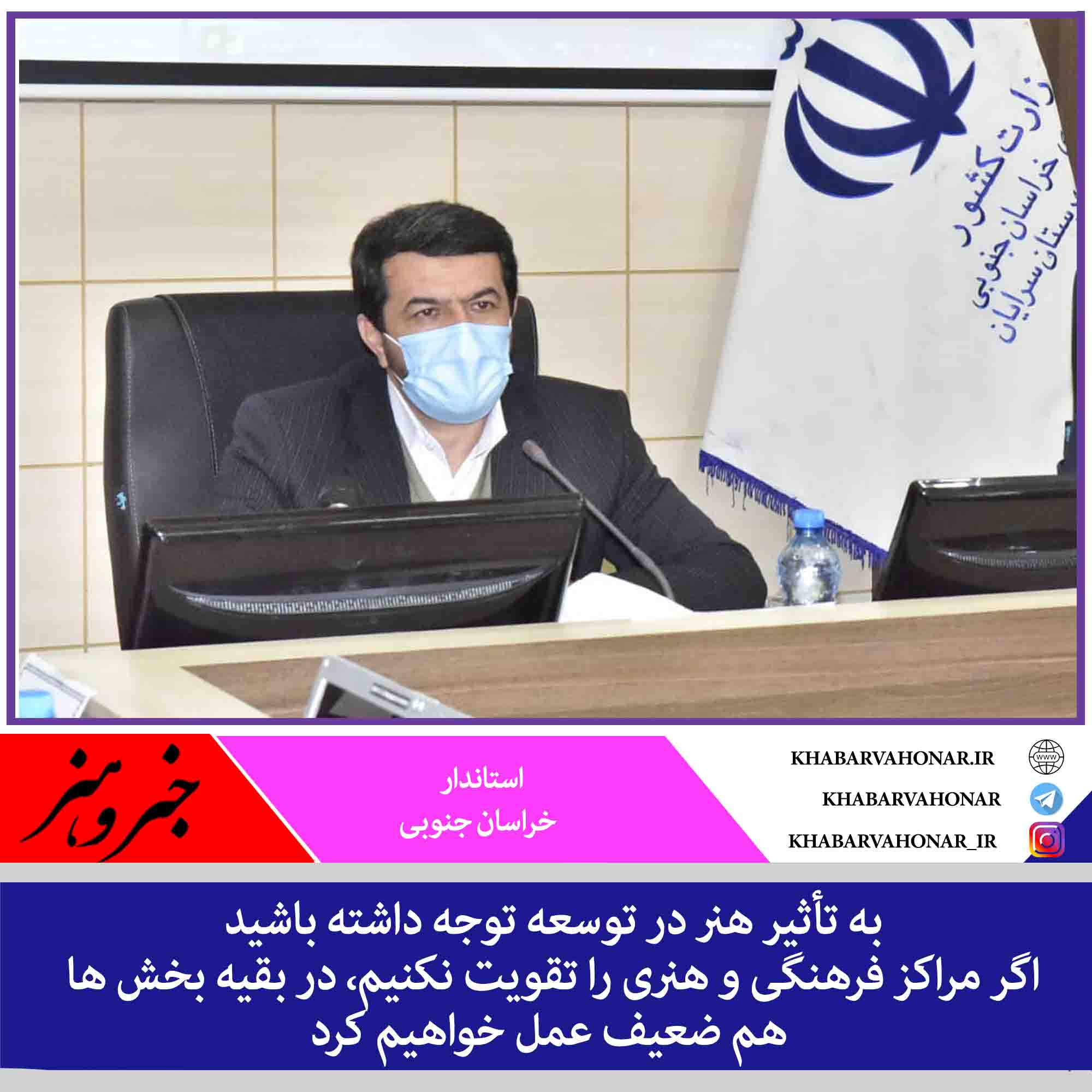 ?استاندار خراسان جنوبی خطاب به مدیران گفت: به تأثیر هنر در توسعه توجه داشته باشید، چرا که کار هنری می تواند بهترین راهکار در نتیجه بخشی امور باشد.