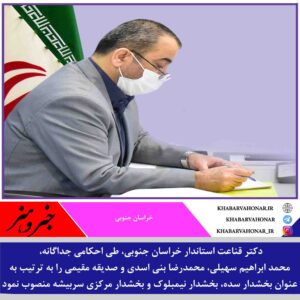?؛ دکتر قناعت استاندار خراسان جنوبی، طی احکامی جداگانه، محمد ابراهیم سهیلی، محمدرضا بنی اسدی و صدیقه مقیمی را به ترتیب به عنوان بخشدار سده، بخشدار نیمبلوک و بخشدار مرکزی سربیشه منصوب نمود.