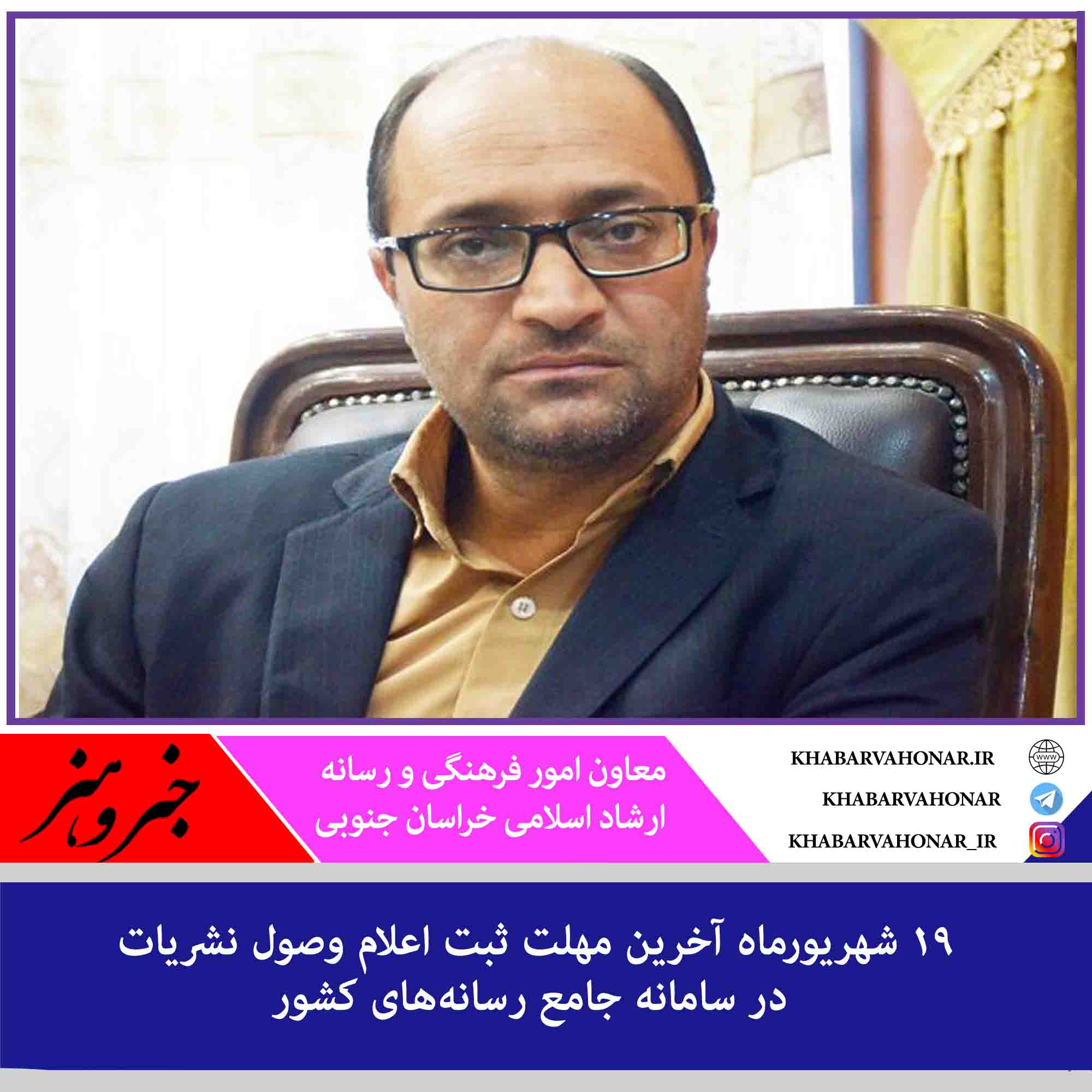 معاون امور فرهنگی و رسانه اداره کل فرهنگ و ارشاد اسلامی خراسان جنوبی گفت: تمامی اعلام وصول روزنامهها و نشریات باید حداکثر تا پایان وقت اداری چهارشنبه، ۱۹ شهریورماه، در سامانه جامع رسانههای کشور، ثبت شده باشد.محمود رمضانی از اطلاعیه مهم اداره کل رسانههای داخلی در خصوص تسویه یارانه حمایتی ششماهه اول سالجاری مطبوعات خبر داد.