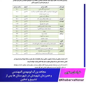 شهرستان مکان مراسم تاریخ ساعت مراسم بیرجند آستان امام زادگان باقریه ۱۷ دی ۱۸:۰۰ تجمع هیئات عزاداری در گلزار شهدای گمنام و حرکت به