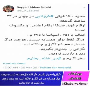#در_خانه_میمانیم #شکست_کرونا_مردم_همدلی #کرونا_را_شکست_میدهیم #رعایت_بهداشت_فردی وزیر فرهنگ و ارشاد اسلامی : نگرانی را جدیتر بگیریم مگر فقط مال همسایه نیست، هرچند مرگ