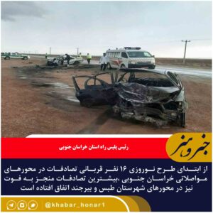 از ابتدای طرح نوروزی ۱۶ نفر قربانی تصادفات در محورهای مواصلاتی خراسان جنوبی