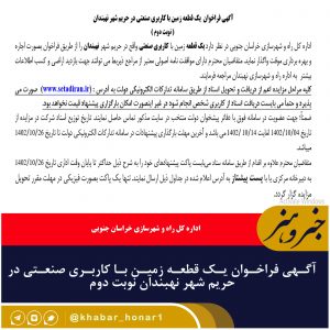 آگهی فراخوان یک قطعه زمین با کاربری صنعتی در حریم شهر نهبندان نوبت دوم
