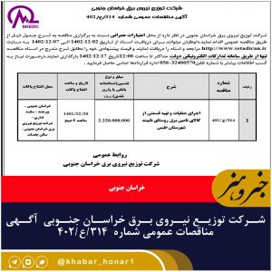 شرکت توزیع نیروی برق خراسان جنوبی آگهی مناقصات عمومی شماره ۳۱۴/ع/۴۰۲