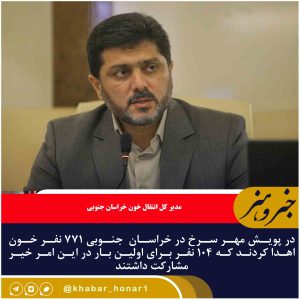 مدیر کل انتقال خون خراسان جنوبی گفت: در پویش مهر سرخ در خراسان جنوبی ۷۷۱ نفر خون اهدا کردند که ۱۰۴ نفر برای اولین بار