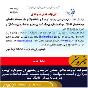 آگهی مزایده عمومی یک مرحله ای شرکت آب وفاضلاب استان خراسان جنوبی در نظردارد “ بهره برداری و استفاده موقت از پساب تصفیه خانه فاضلاب
