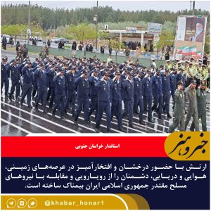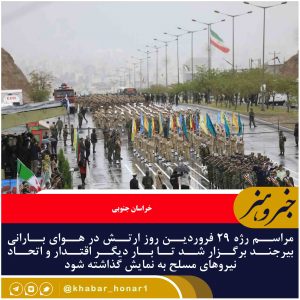 مراسم رژه ۲۹ فروردین روز ارتش در هوای بارانی بیرجند برگزار شد تا بار دیگر اقتدار و اتحاد نیروهای مسلح به نمایش گذاشته شود. همزمان