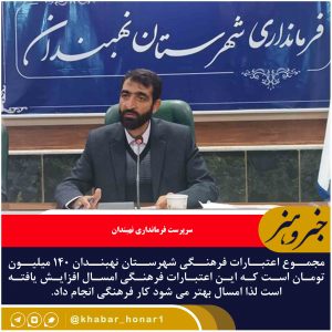 سرپرست فرمانداری نهبندان گفت: مجموع اعتبارات فرهنگی شهرستان نهبندان ۱۴۰ میلیون تومان است که این اعتبارات فرهنگی امسال افزایش یافته است لذا امسال بهتر می