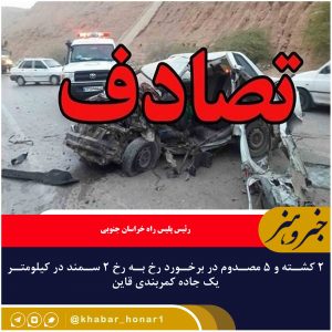 رئیس پلیس راه استان گفت: امروز ظهر در کیلومتر یک جاده کمربندی قاین بر اثر برخورد ۲ سواری سمند، ۲ نفر جان خود را از