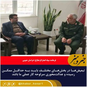 فرمانده سپاه انصارالرضا(ع) خراسان جنوبی گفت: تبعیضها در بخشهای مختلف باید به حداقل ممکن رسیده و عدالتمحوری سرلوحه کار عملی ما باشد. مردم از پرداخت مالیات