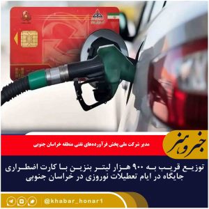 توزیع قریب به ۹۰۰ هزار لیتر بنزین با کارت اضطراری جایگاه در ایام تعطیلات نوروزی ممدیر شرکت ملی پخش فرآوردههای نفتی منطقه خراسان جنوبی گفت: