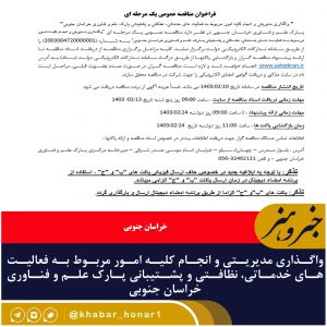 واگذاری مدیریتی و انجام کلیه امور مربوط به فعالیت های خدماتی، نظافتی و پشتیبانی پارک علم و فناوری خراسان جنوبی