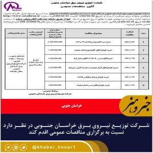شرکت توزیع نیروی برق خراسان جنوبی در نظر دارد نسبت به برگزاری مناقصات عمومی اقدم کند