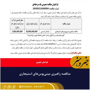 ۲فراخوان مناقصه عمومی یک مرحلهای شماره مناقصه: ۲۰۰۳۰۹۲۱۲۶۰۰۰۰۰۴ شرکت ملی پخش فرآورده های نفتی منطقه خراسان جنوبی در نظر دارد با رعایت قانون برگزاری مناقصات،