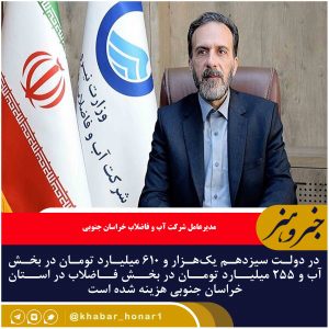 در دولت سیزدهم یکهزار و ۶۱۰ میلیارد تومان در بخش آب و ۲۵۵ میلیارد تومان در بخش فاضلاب در استان خراسان جنوبی هزینه شده است