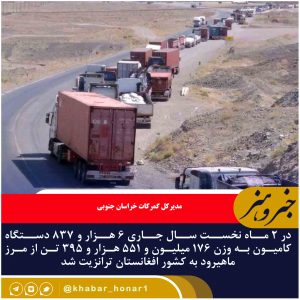 مدیرکل گمرکات خراسان جنوبی گفت: در ۲ ماه نخست سال جاری ۶ هزار و ۸۳۷ دستگاه کامیون به وزن ۱۷۶ میلیون و ۵۵۱ هزار و