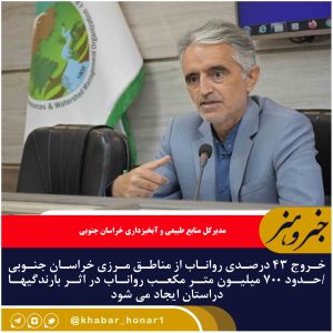 ۴۳ درصد رواناب سالانه در خراسان جنوبی، از مرزهای استان خارج میشود. مدیرکل منابع طبیعی و آبخیزداری استان با بیان اینکه سالانه حدود ۷۰۰ میلیون