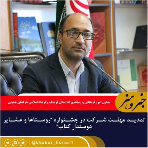 معاون امور فرهنگی و رسانهای ادارهکل فرهنگ و ارشاد اسلامی خراسان جنوبی از تمدید مهلت شرکت در جشنواره روستاها و عشایر دوستدار کتاب تا ۳۱