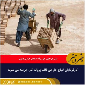 مدیر کل تعاون، کار و رفاه اجتماعی خراسان جنوبی: مبلغ جریمه بابت هر روز اشتغال غیر مجاز اتباع خارجی ۱۱ میلیون و ۹۴۳ هزار و
