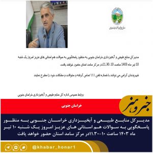 مدیرکل منابع طبیعی و آبخیزداری خراسان جنوبی به منظور پاسخگویی به سوالات هم استانی های عزیز امروز یک شنبه ۱۰ تیر ماه ۱۴۰۳ ساعت ۱۰-۱۱.۳۰در