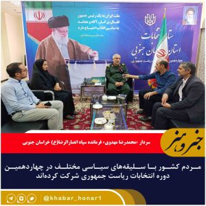 – استاندار خراسان جنوبی گفت: شاهد حضور پرشور و نشاط مردم در پای صندوقهای رای بوده ایم و درصد مشارکت استان خوب است. جواد قناعت