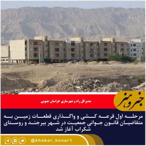 مدیرکل راه و شهرسازی خراسان جنوبی گفت: مرحله اول قرعه کشی و واگذاری قطعات زمین به متقاضیان قانون جوانی جمعیت در شهر بیرجند و روستای