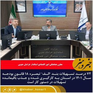 معاون هماهنگی امور اقتصادی استاندار خراسان جنوبی گفت: ۷۲ درصد تسهیلات بند “الف” تبصره ۱۸ قانون بودجه سال ۱۴۰۱ در استان به کارگیری شده و