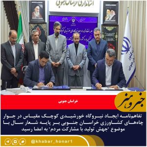تفاهمنامه ایجاد نیروگاه خورشیدی کوچک مقیاس در جوار چاههای کشاورزی خراسان جنوبی بر پایه شعار سال با موضوع “جهش تولید با مشارکت مردم” به امضا
