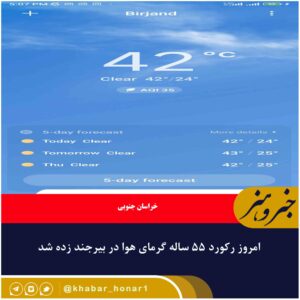 🔹دمای هوا امروز به ۴۲.۱ درجه سلسیوس رسید که در ۵۵ ساله گذشته بی سابقه بوده است. 🔹دمای هوا در ۱۰ شهر خراسان جنوبی به