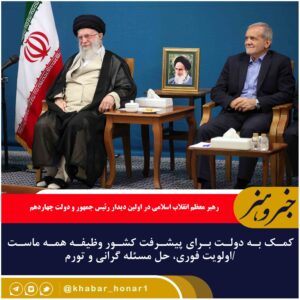 رهبر معظم انقلاب اسلامی در اولین دیدار رئیس جمهور و دولت چهاردهم، با شکرگذاری تشکیل سریع دولت با همت رئیس جمهور و کمک ارزنده مجلس،