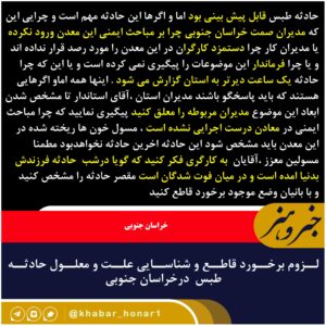 🔹متاسفانه حداقلهای ایمنی در این معدن رعایت نشده بود و قبل از اینکه گاز به بلوک دیگر معدن نفوذ کند متاسفانه کوچکترین اطلاعرسانی نشده بود.