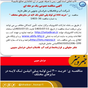 شرکت آب و فاضلاب خراسان جنوبی در نظر دارد: مناقصه ی“ خرید ۳۰۰ تن لوله پلی اتیلن تک لایه در سایزهای مختلف “ به شماره
