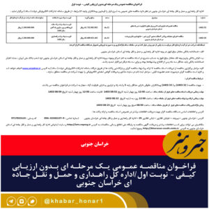 فراخوان مناقصه عمومی یک مرحله ای بدون ارزیابی کیفی – نوبت اول اداره کل راهداری و حمل و نقل جاده ای خراسان جنوبی در نظر
