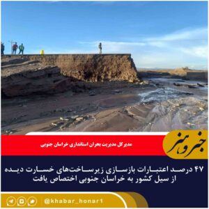 ۴۷ درصد اعتبارات بازسازی زیرساختهای خسارت دیده از سیل کشور به خراسان جنوبی اختصاص یافت