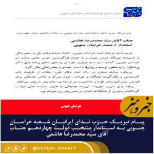 پیام تبریک حزب ندای ایرانیان شعبه خراسان جنوبی به استاندار منتخب دولت چهاردهم جناب آقای سیّد محمدرضا هاشمی