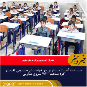 – مدیرکل آموزش و پرورش خراسان جنوبی گفت: زمان آغاز مدارس استان در تمامی مقطع تحصیلی از اول دی ماه جاری ساعت ۷:۳۰ تعیین شد.