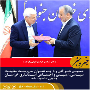 🔹استاندار خراسان جنوبی، حسین شرافتی راد را به عنوان سرپرست معاونت سیاسی، امنیتی و اجتماعی استانداری، منصوب کرد. ی؛ سید محمدرضا هاشمی طی مراسمی حکم