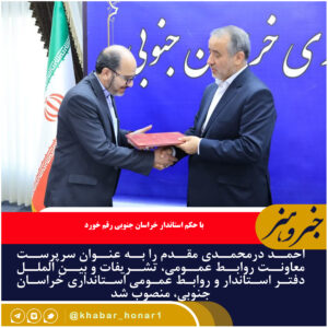 احمد درمحمدی مقدم را به عنوان سرپرست معاونت روابط عمومی، تشریفات و بین الملل دفتر استاندار و روابط عمومی استانداری خراسان جنوبی، منصوب شد