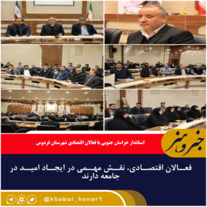 🔹استاندار خراسان جنوبی گفت: فعالان اقتصادی، نقش مهمی در ایجاد امید در جامعه دارند. سید محمدرضا هاشمی پنجشنبه شب در نشست با فعالان اقتصادی شهرستان