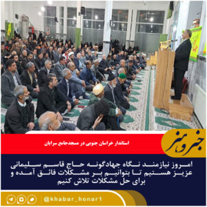 استاندار خراسان جنوبی در مسجدجامع سرایان گفت امروز نیازمند نگاه جهادگونه حاج قاسم سلیمانی عزیز هستیم تا بتوانیم بر مشکلات فائق آمده و برای حل