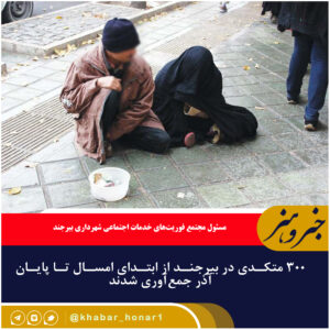 مسئول مجتمع فوریتهای خدمات اجتماعی شهرداری بیرجند گفت: از ابتدای امسال تا پایان آذر، ۳۰۰ متکدی زن و مرد از شهر بیرجند جمع آوری و