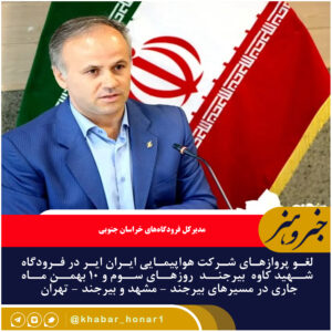 مدیرکل فرودگاههای خراسان جنوبی از لغو پروازهای شرکت هواپیمایی ایران ایر در فرودگاه شهید کاوه بیرجند روزهای سوم و ۱۰ بهمن ماه جاری در مسیرهای
