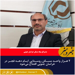 مدیرکل بنیاد مسکن خراسان جنوبی گفت: در دهه فجر سال جاری دو هزار واحد مسکن روستایی در استان افتتاح می شود. قاسم تنها صبح شنبه