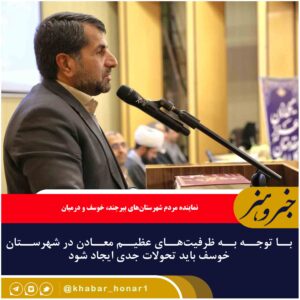 نماینده مردم شهرستانهای بیرجند، خوسف و درمیان در مجلس شورای اسلامی گفت: با توجه به ظرفیتهای عظیم معادن در شهرستان خوسف باید تحولات جدی ایجاد