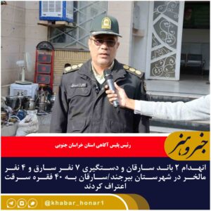 رئیس پلیس آگاهی استان خراسان جنوبی از انهدام ۲ باند سارقان و دستگیری ۷ نفر سارق و ۴ نفر مالخر در شهرستان بیرجند خبر داد