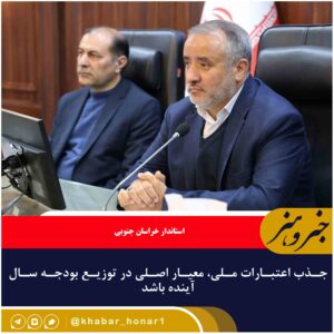 🔹استاندار خراسان جنوبی تأکید کرد: برای سال آینده، معیار اصلی در توزیع اعتبارات بین دستگاههای اجرایی استان، میزان توانمندی در جذب اعتبارات ملی باشد. سید